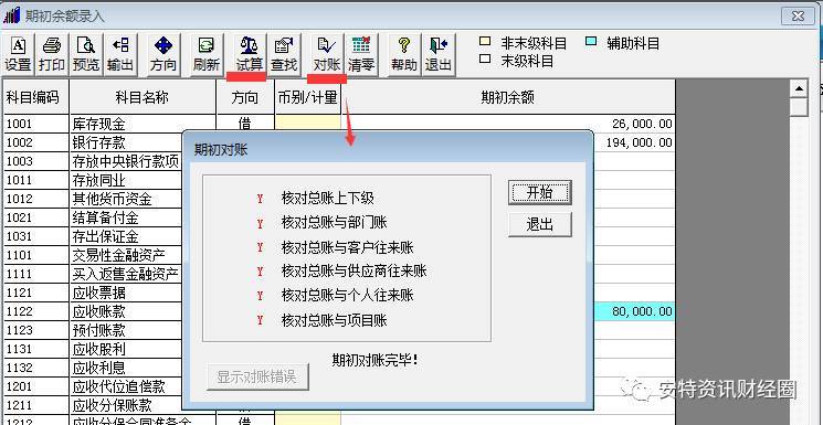 具體步驟:總賬下拉菜單-->設(shè)置-->期初余額-->試算&對賬。