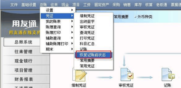 3、退出上面的窗口后,再依次點擊總賬——憑證——恢復記賬前狀態(tài)。