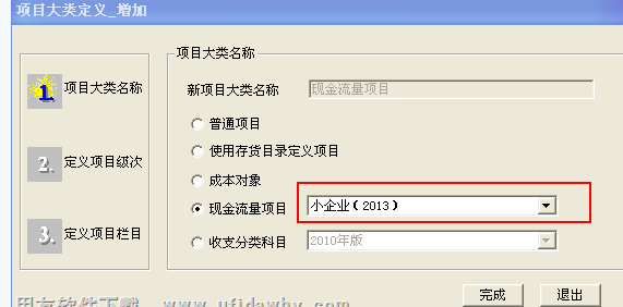2、再依次點擊基礎(chǔ)設(shè)置-財務(wù)-項目目錄-增加-現(xiàn)金流量項目,選擇“小企業(yè)2013”,點擊完成后提示“預(yù)置完畢”;