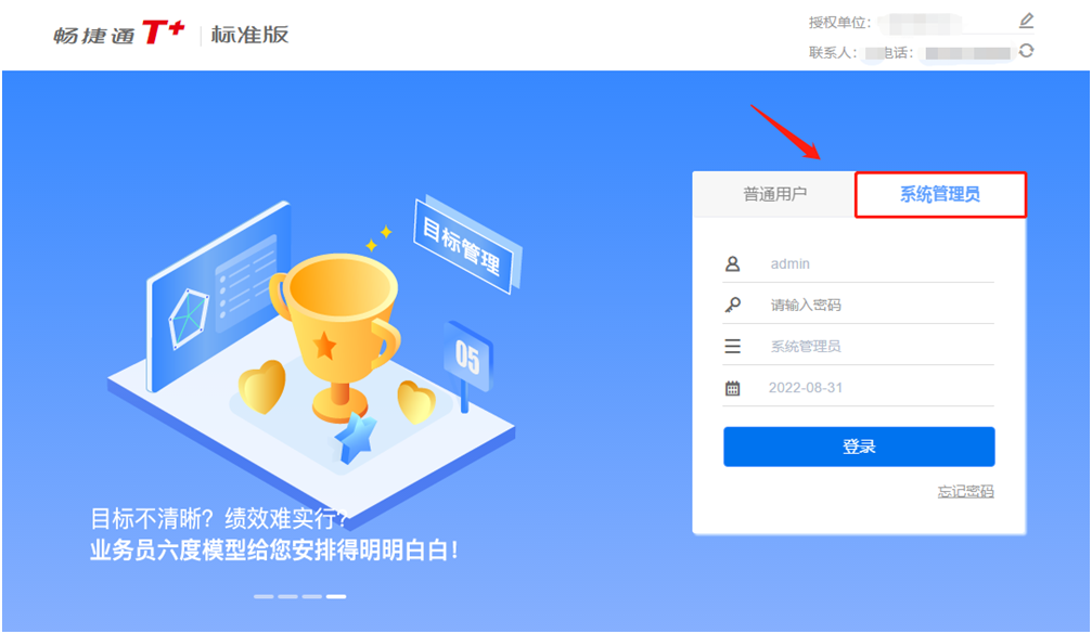 1、運(yùn)行T+至登錄首界面,選擇【系統(tǒng)管理員】進(jìn)行登錄。