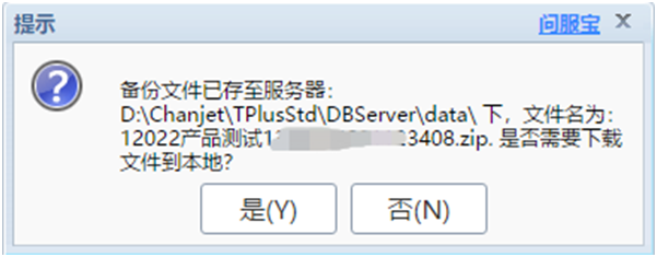3、備份成功后文件會(huì)保存到指定的服務(wù)器路徑,同時(shí)會(huì)提示是否需要下載文件到本地,如果在服務(wù)器上備份則可選“否”,若在客戶端進(jìn)行備份操作則可選“是”,把備份文件下載到本地的電腦,實(shí)現(xiàn)異機(jī)二重備份。(PS.備份完成后亦可將備份文件拷貝到U盤或上傳網(wǎng)盤,進(jìn)行多重備份保障)