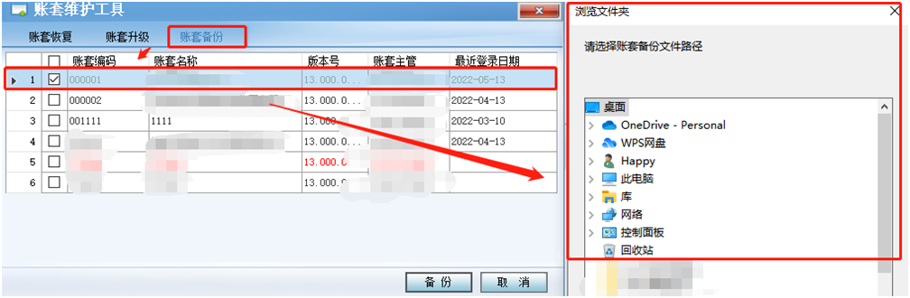 2、選擇【賬套備份】后,可以批量勾選所需備份的賬套明細(xì),點(diǎn)擊下方【備份】按鈕,在彈出的【瀏覽文件夾】小窗中指定備份存儲(chǔ)的路徑點(diǎn)擊【確定】即可開始備份。