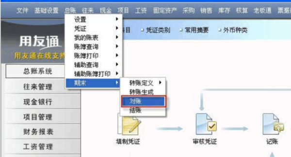1、依次點擊總賬——期末——對賬。