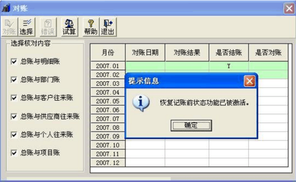 2、在彈出的窗口中,直接按Ctrl+H組合鍵,彈出一個提示“恢復(fù)記賬前狀態(tài)功能已被激活”,再點擊〖確定〗按鈕