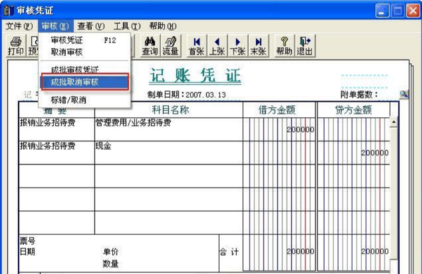 2、也可以成批取消審核。雙擊其中的任意一行進入“審核憑證”界面,再依次點擊審核-成批取消審核即可。如圖所示