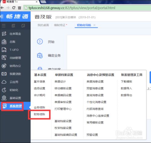 打開軟件,在界面左側的菜單欄中選擇“系統(tǒng)管理”,點擊“期末處理”中的“財務結賬”。