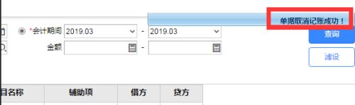 在當前界面的右上角出現(xiàn)“單據(jù)取消記賬成功!”的提示信息,表示所選的憑證反記賬成功。