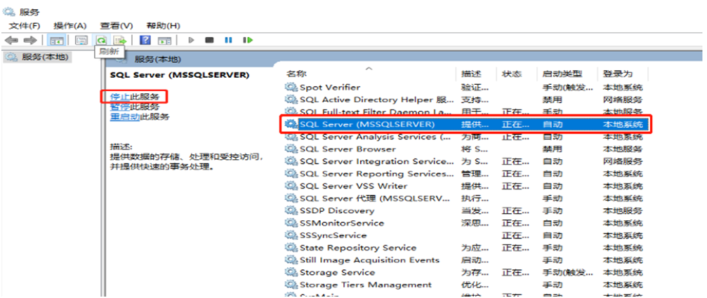 點擊【開始】—【控制面板】—【管理工具】—【服務】,找到數據庫服務SQL Server(MSSQLSERVER),點擊右鍵,將服務停止。
