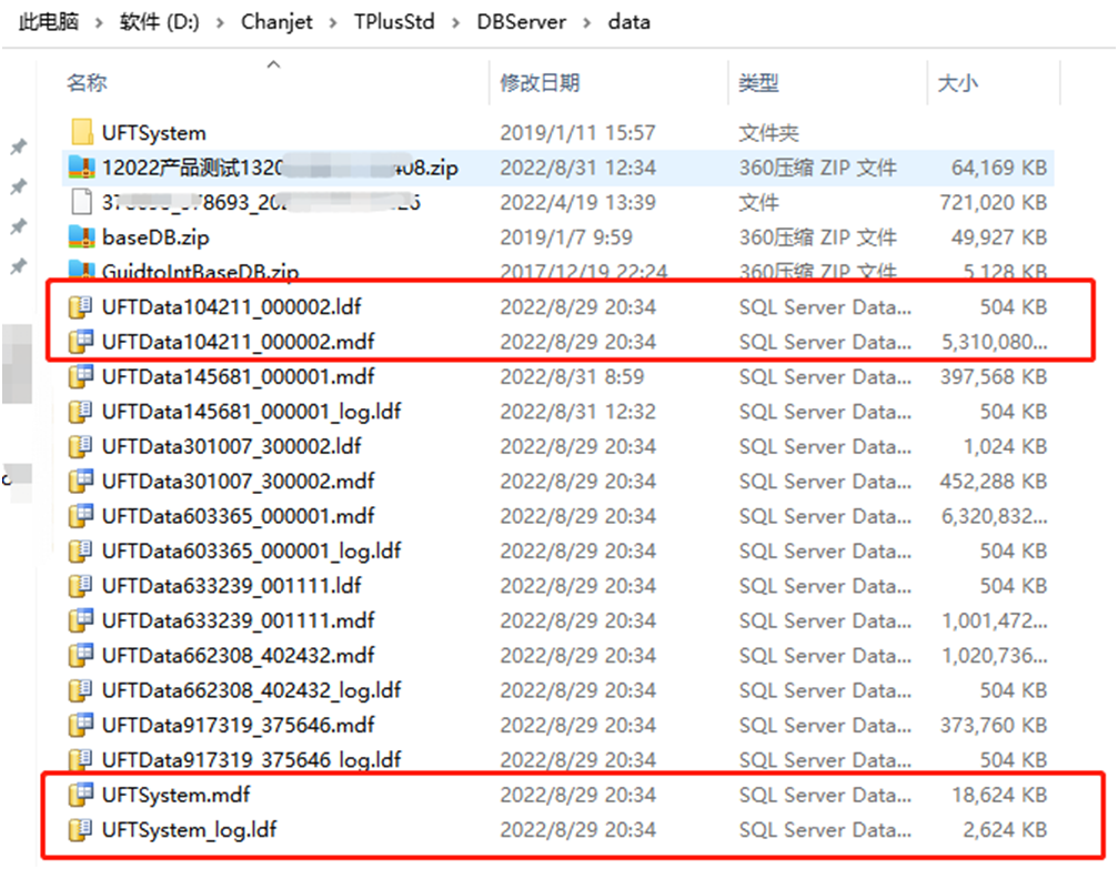 2、進入軟件安裝路徑的data文件夾(X:\Chanjet\TPlusStd\DBServer\data)下,找到*.mdf和*.ldf的賬套庫物理文件和系統(tǒng)庫物理文件,如下圖,在數據庫服務停止之后將這些文件備份好,或者可以直接把data文件夾進行備份。